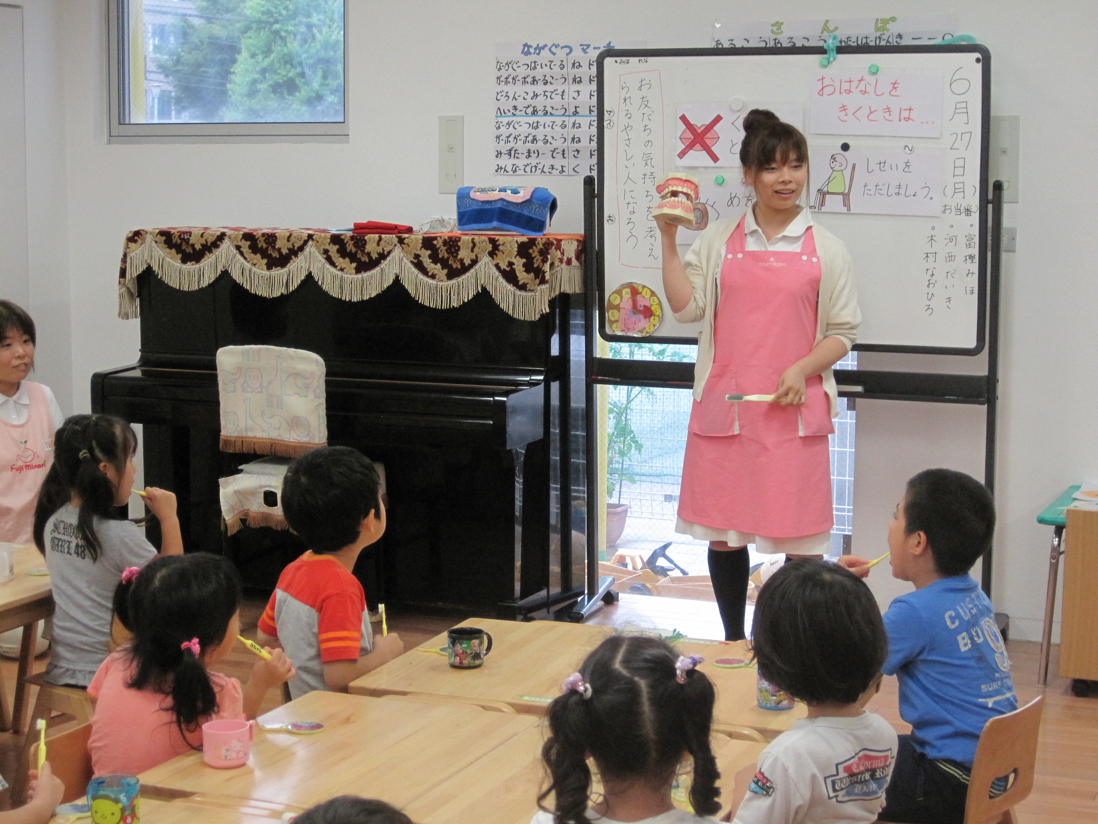 年長児対象に歯磨きの仕方について歯科衛生士さんのお話を聞きました。初めに「どうして虫歯になるの?」という紙芝居を見た後、実際にビスケットを食べて、うがいをしてから鏡を見るとみんなびっくり!!奥歯に食べかすがたくさんついていました。取り切れない食べかすをさっそくブラッシング!特に奥歯と歯と歯の間をよーく磨きました。歯磨きのポイントは1.磨く順番を決める。2.一か所を10回ずつ磨く。3.歯ブラシを歯にきちんとあてる。4.必ず大人が仕上げ磨きをする。歯磨き後は、もう一度鏡でチェック!しました。これを機会にこれからも正しい歯磨きをして歯を大切にすることでしょう。