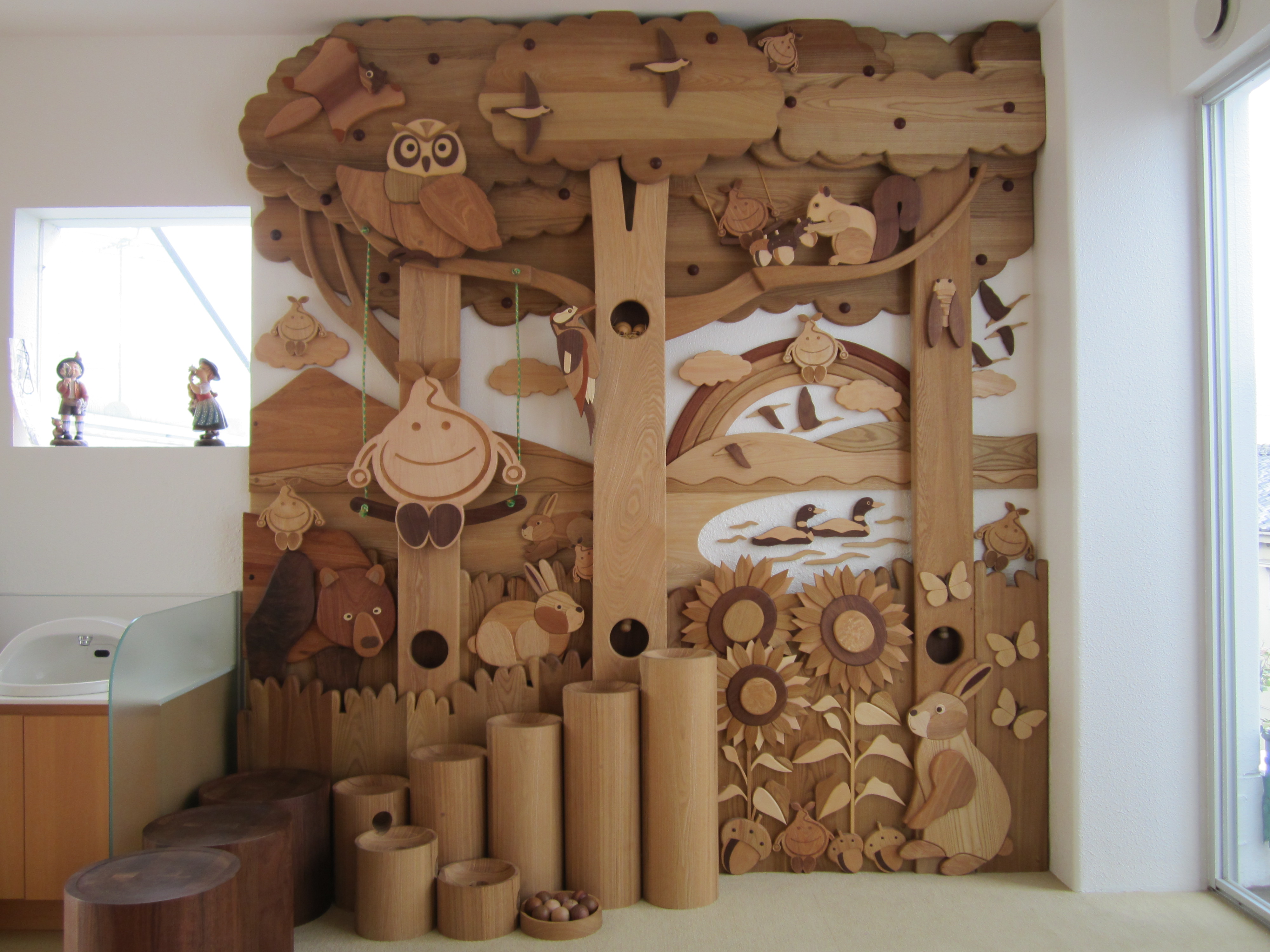 3階の踊り場に大型の木製玩具が、新しく仲間いりしました。子どもたちが保育園のいろいろな場所でより楽しく遊べるようにとの思いで設置されました。天然木を使った木製玩具は保育園のマスコットふーちゃんがかくれんぼしています。