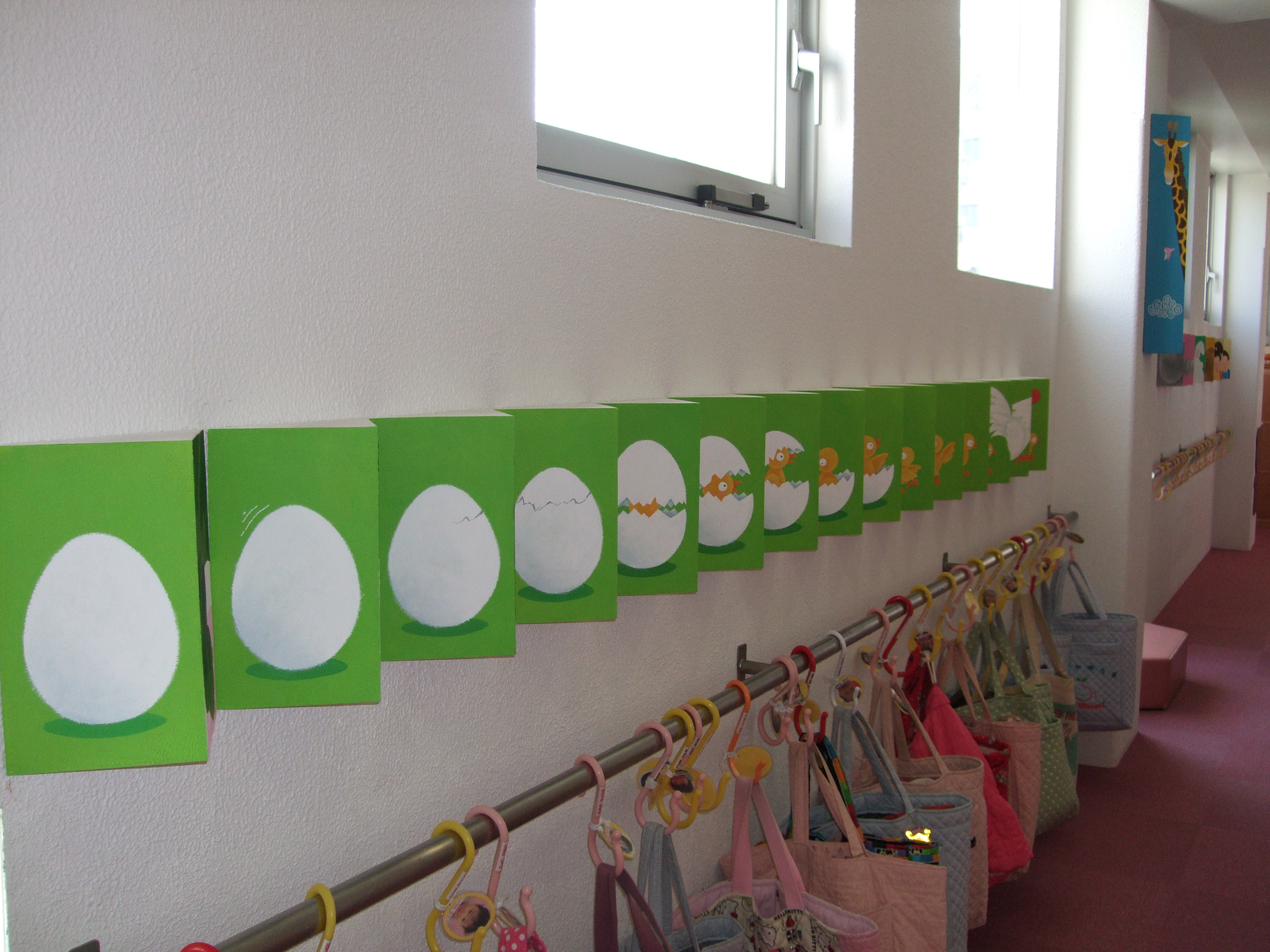 0歳児と1歳児のエリアの壁面に面白い物がついたよ!! 右から見るのと、左から見るのと絵が違うよ・・・ 卵から何かが、生まれたよ。みんな、見にきてください。 ふしぎ・ふしぎ・ふしぎなところだな??