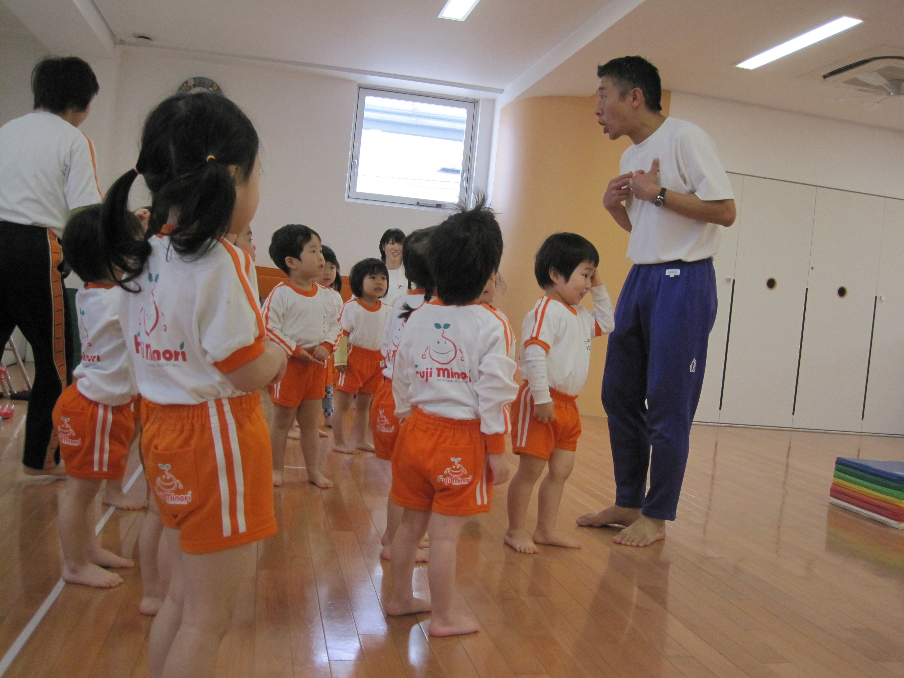 今年度の体育指導が今日から始まりました。 3才児は、初めての体育指導・・・朝日先生に楽しく教えて もらいました。 2歳児の頃から、ホ-ルをのぞいては体育指導に興味を持っていました。 この1年でどれだけ成長出来るかなぁ!!
