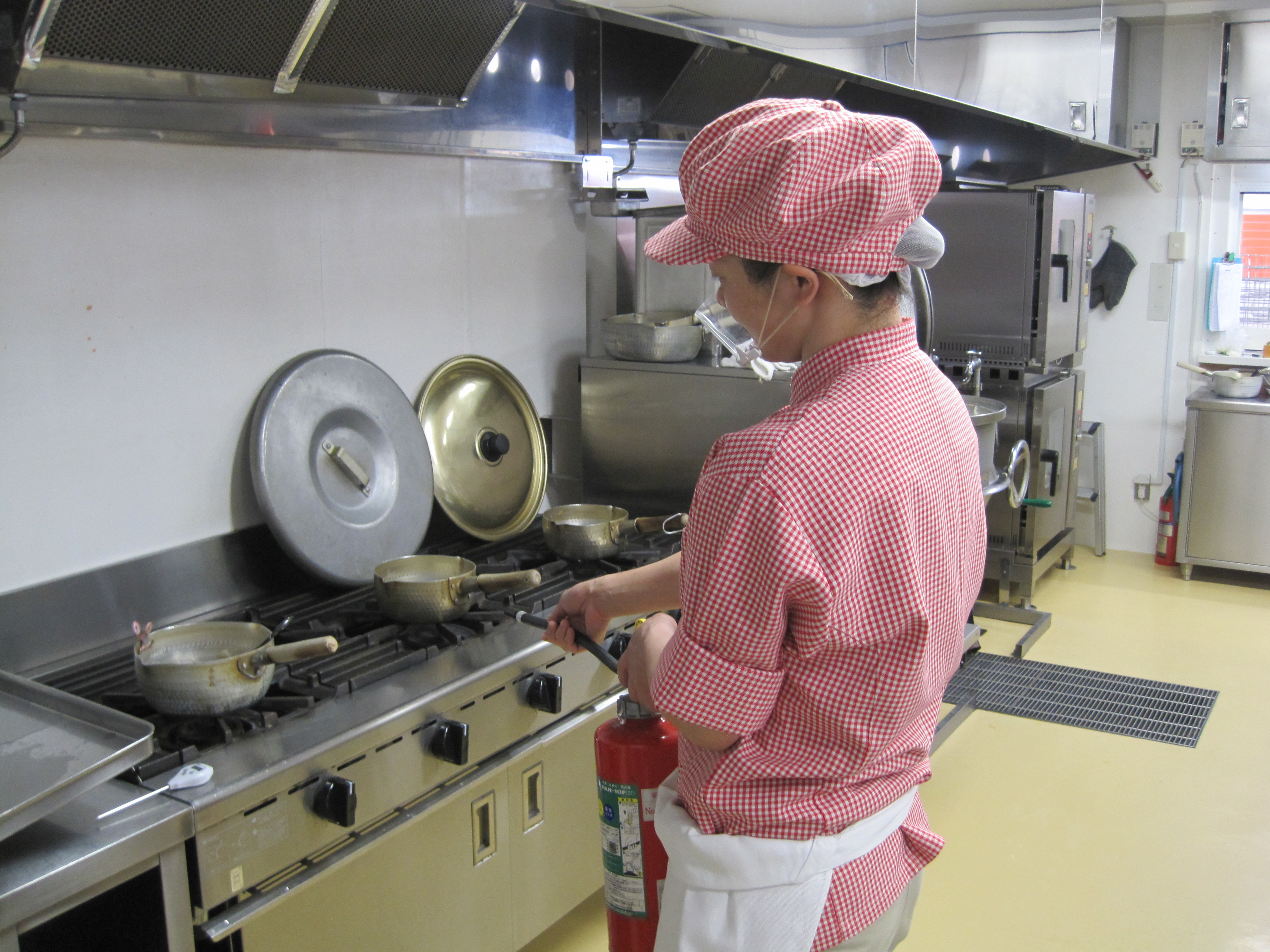今日は火災を想定して避難誘導訓練を行いました。 子どもたちを安全に避難させるだけでなく、まずは給食の先生が 初期消化行いますが、普段なかなか目にしない光景です。