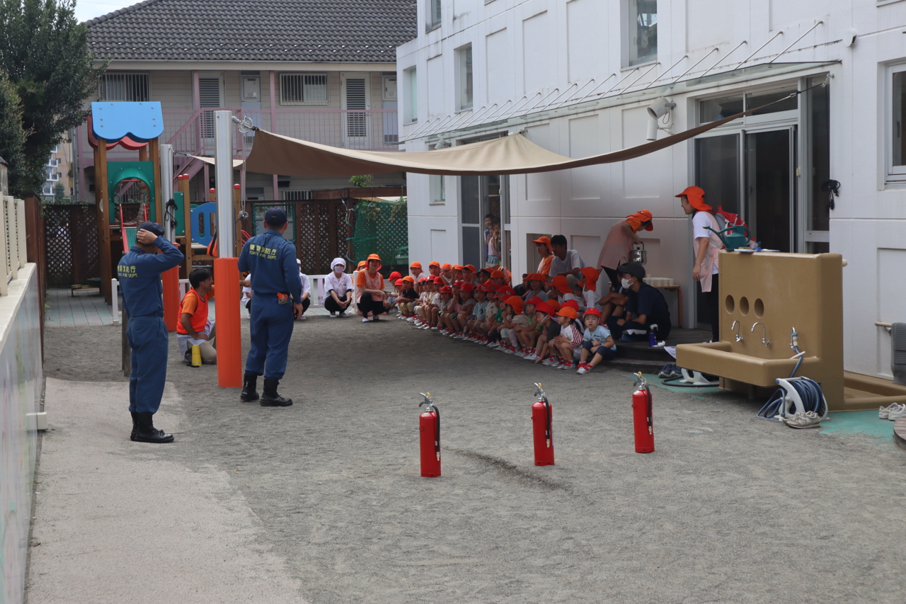 本日、消防署から消防士の方が来園し、隣のアパートからの出火を想定した消火訓練を行いました。
