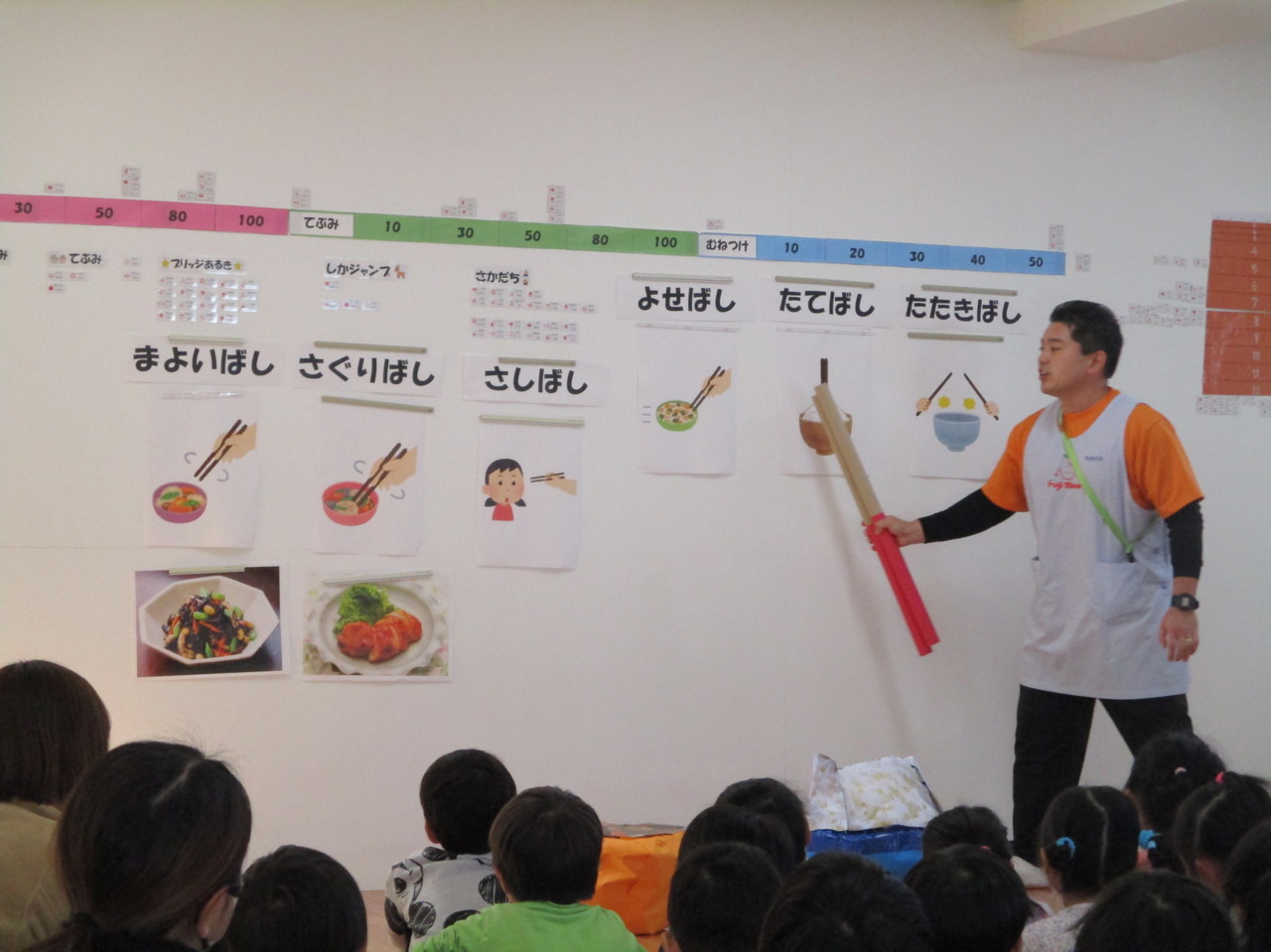途中からは子どもたちも前に出て、実際に箸を持って挑戦。