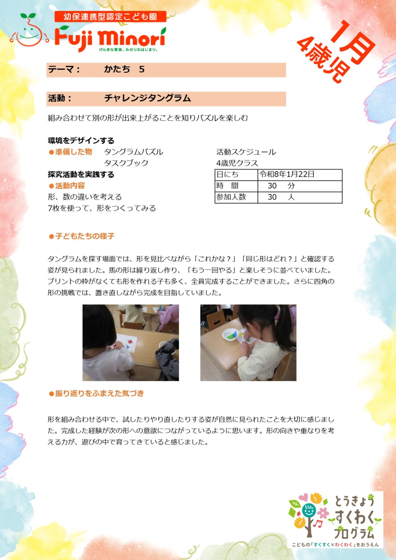 すくわくプログラム 4歳児11回目1/22テーマ「かたち5」~チャレンジタングラム~